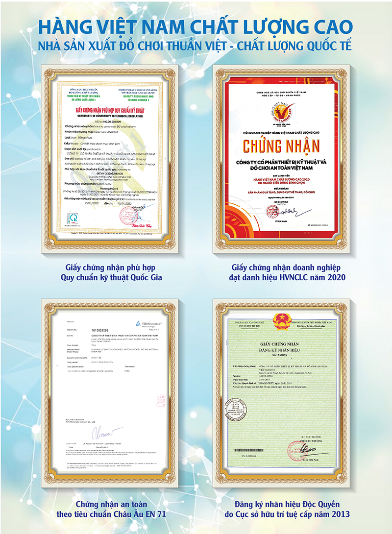 Tất cả các sản phẩm đồ chơi của Công ty Đồ Chơi An Toàn Việt Nam đều được tìm tòi, nghiên cứu một cách kỹ lưỡng và cẩn thận trên cơ sở lý thuyết có khoa học để đảm bảo mang lại cho trẻ em những món đồ chơi tốt, phù hợp với lứa tuổi, đa giá trị và giúp trẻ phát triển toàn diện về cả thể chất lẫn tinh thần.