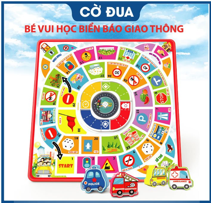 - Bàn cờ đua giao thông: Các ô trên đường đua được kết hợp cùng hệ thống biển báo giao thông Việt Nam. Người tham gia chơi sẽ vổ xúc xắc để ngẫu nhiên đi trên các ô này. Mỗi ô được bố trí kèm 1 biển báo giao thông có những chức năng riêng chắc chắn sẽ khiến bạn đi từ thú vị này tới ngạc nhiên khác.