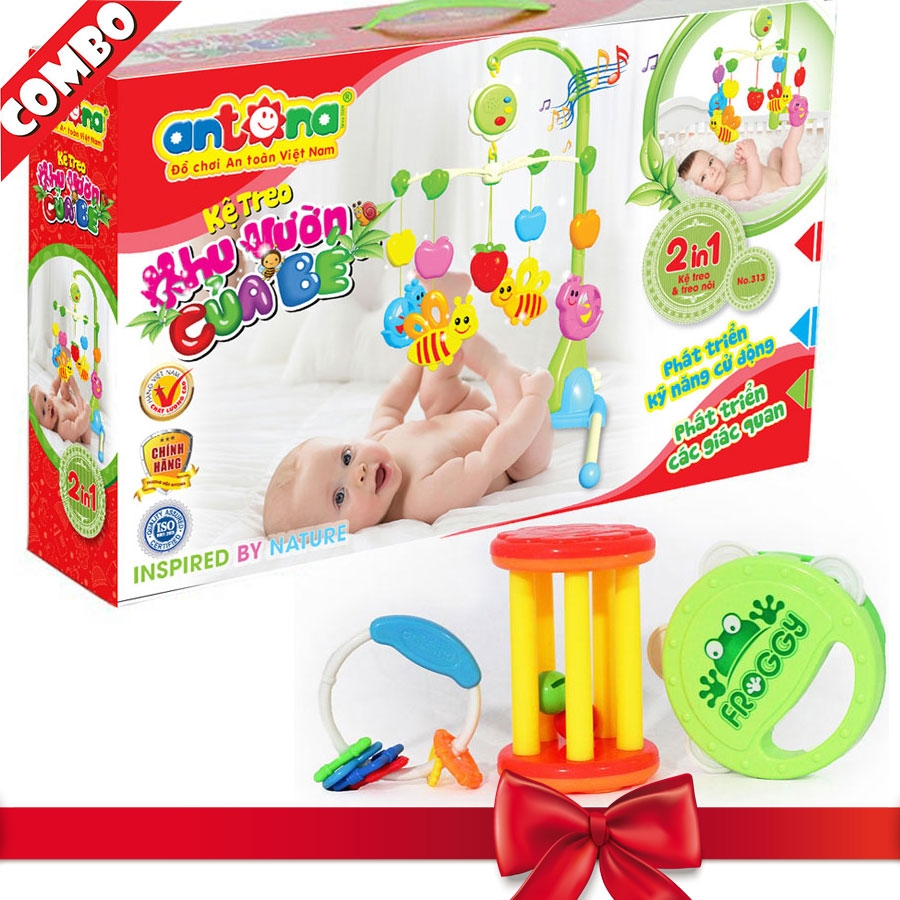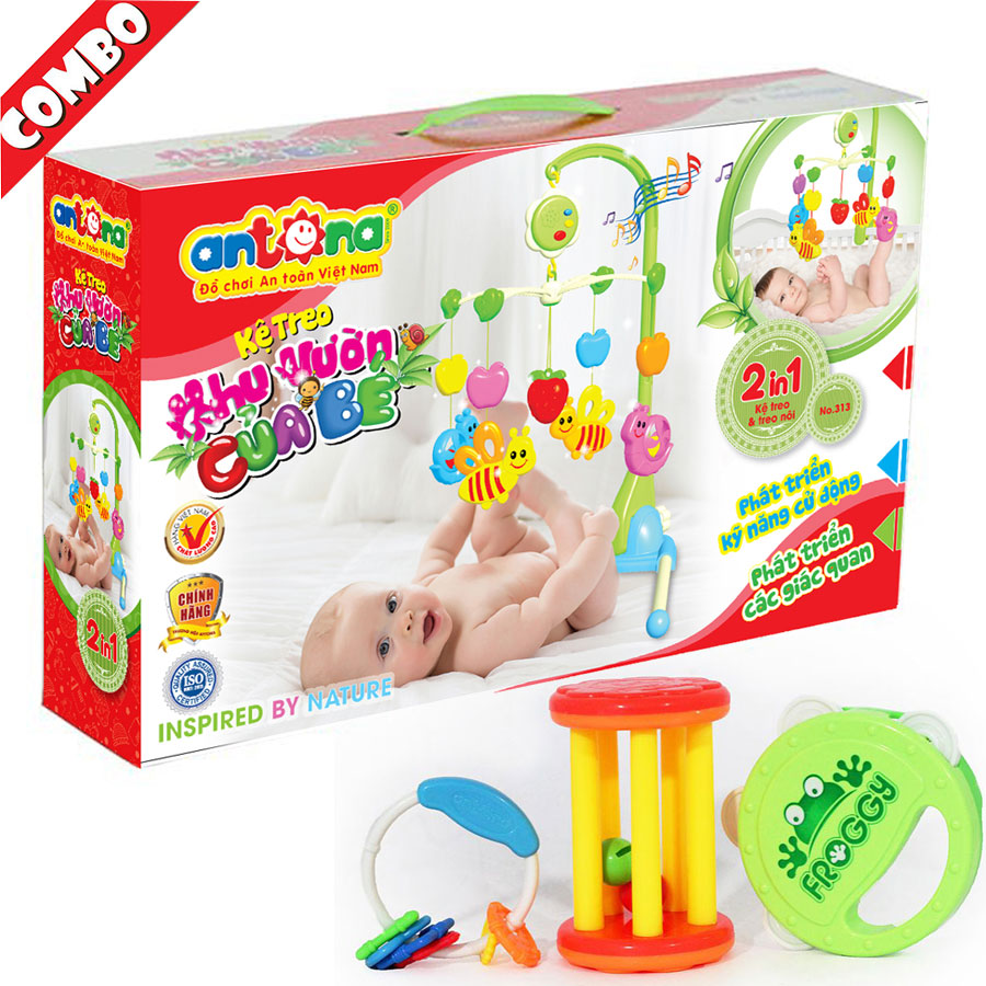 Bộ sản phẩm bao gồm: 1 Kệ treo nôi Khu vườn của bé và 1 Túi xúc xắc gồm 3 chiếc